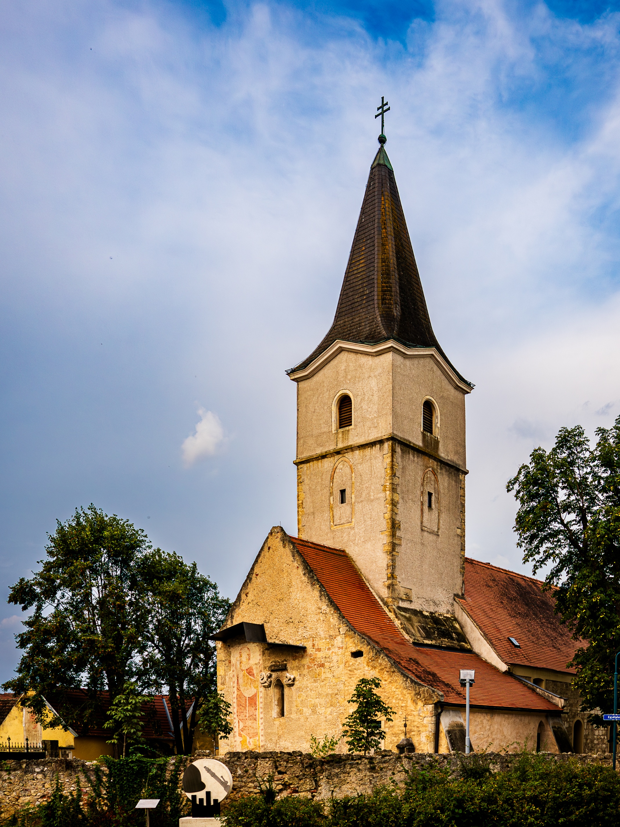 12./13.Jh. Aus dieser Zeit stammen die außen am Kirchenturm und Dach eingebauten mindestens 10 Hügelkreuzgrabplatten mit Tatzenkreuzen.